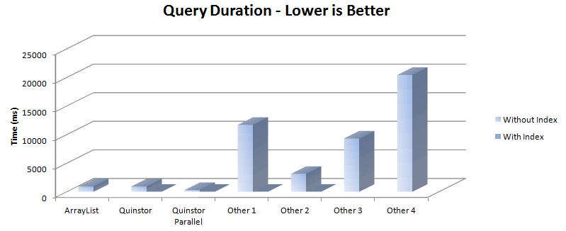 This chart compares the time to query 3 million objects in the same stores. The ArrayList implementation was a simple iterate over the contents with hand-crafted Java to query the object - the fastest we could expect without parallelism or indexes. Again, Quinstor comfortably outperforms the alternatives.