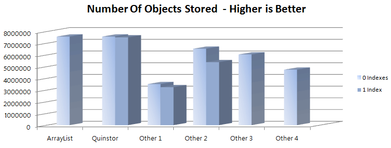 The chart above compares Quinstor's storage to a number of other mainstream in-memory data stores. All were constrained to the same 4GB heap. For comparison, the same test was performed with an ArrayList - a dynamically sized container with one of the lowest overheads.